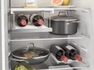 Držák lahví BottleFlex lze upravit podle obsahu lednice. Buď jej můžete zavěsit do jiné police nebo složit a umístit na polici.