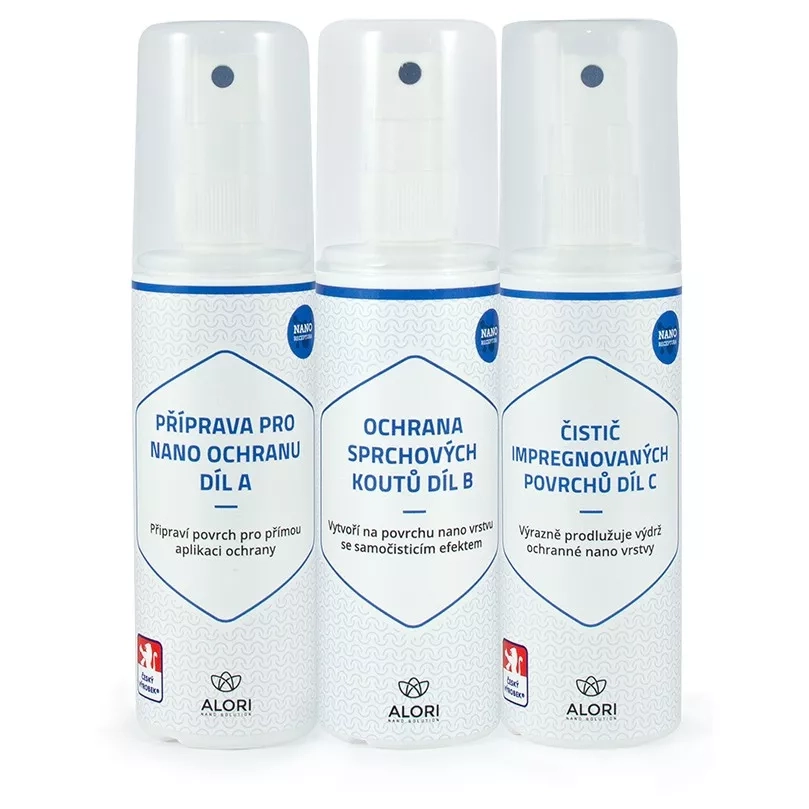 Balíček pro ochranu sprchového koutu obsahuje tři kroky pro dokonalou péči o všechny části sprchového koutu ze skla nebo z plastu. Co to znamená? Už žádné usazeniny od vodního kamene na zástěně nebo mastnoty ve vaničce. Díky nanotechnologii už po první aplikaci vytvoří na povrchu neviditelný film se samočisticím efektem. Tato vrstva vytvoří naprosto hladký a perfektně rovný povrch, na kterém nemůže ulpět vodní kámen, mastnota ani jiné nečistoty (efekt lotosového květu více zde – odkaz na vysvětlení na našich stránkách). Zajistí vám méně práce a kratší čas při následné údržbě vašeho sprchového koutu. Při správné péči vydrží nano ochrana na povrchu 12 měsíců a déle. Ochrana i čističe mají formu kapaliny. Pro snadnější použití a úsporu jsou všechny lahvičky opatřeny prstovým rozprašovačem. Jsou baleny v bílých lahvičkách z chemicky odolného plastu. Lahvičky mají kulatý tvar, velmi dobře se drží a při použití nevyklouzávají z rukou. Celé balení je uzpůsobeno tak, aby prostředek nevytekl ani při položení. Balíček obsahuje: Příprava pro nano ochranu díl A.: příprava povrchu pro aplikaci nano ochrany. Zbaví povrch nečistot a perfektně jej odmastí. Obsah 100 ml Ochrana sprchových koutů díl B: samotná nano ochrana. Aplikuje se na připravený povrch. Její aplikace je velmi jednoduchá a má dlouhotrvající účinek (při správné péči 1 rok a déle). Obsah 100ml Čistič impregnovaných povrchů díl C: speciálně vyvinutý přípravek pro následné čistění ochráněných povrchů. Zaručuje, že se nano vrstva čištěním nepoškodí a vydrží minimálně 1 rok a déle. Obsah 100ml Proč koupit? Až o 80% vyšší účinnost než běžné čisticí prostředky Zajistí samočisticí efekt Snadnější a kratší následný úklid Dlouhotrvající efekt Nano ochrana před usazováním vodního kamene, mastnoty a dalších nečistot Použití na všechny části sprchového koutu