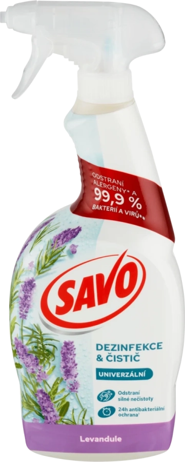 Savo dezinfekční sprej s jemnou vůní levandule je ideální pro každodenní dezinfekci všech omyvatelných povrchů v domácnosti. Spolehlivě odstraňuje 99,9 % bakterií a virů, včetně alergenů jako jsou prach či pyl. Poskytuje až 24hodinovou antibakteriální ochranu, a to bez obsahu chlóru. Jeho složení je dermatologicky testováno a 100% biologicky odbouratelné.
