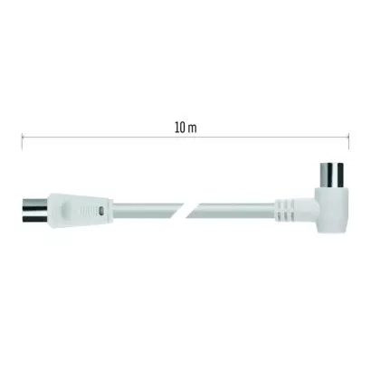 Anténní koaxiální kabel s vidlicí a zásuvkou IEC. Kabel má úhlový konektor (90°). Kabel má dvojité stínění pro redukci elektromagnetického rušení. Délka kabelu je 10 m. Koaxiální kabel je vhodný pro SAT, DVB-T, ANT, DECODER, FLAT TV a TV.