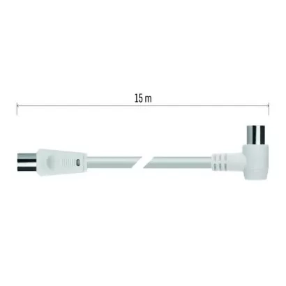 Anténní koaxiální kabel s vidlicí a zásuvkou IEC. Kabel má úhlový konektor (90°). Kabel má dvojité stínění pro redukci elektromagnetického rušení. Délka kabelu je 15 m. Koaxiální kabel je vhodný pro SAT, DVB-T, ANT, DECODER, FLAT TV a TV.