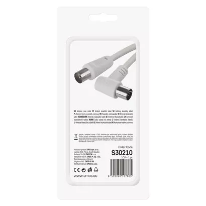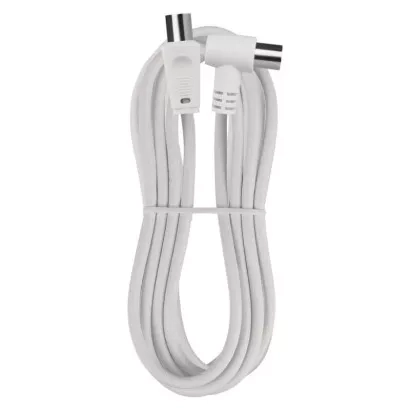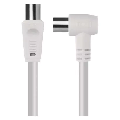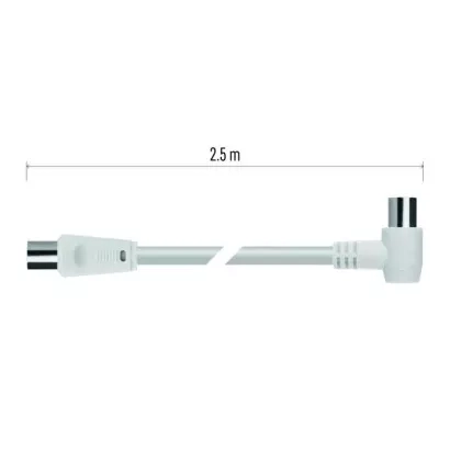 Anténní koaxiální kabel s vidlicí a zásuvkou IEC. Kabel má úhlový konektor (90°). Kabel má dvojité stínění pro redukci elektromagnetického rušení. Délka kabelu je 2,5 m. Koaxiální kabel je vhodný pro SAT, DVB-T, ANT, DECODER, FLAT TV a TV.