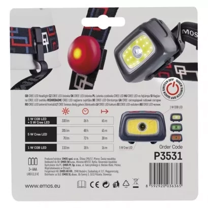 EMOS CREE LED + COB LED čelovka P3531, 330 lm, 65 m, 3× AAA