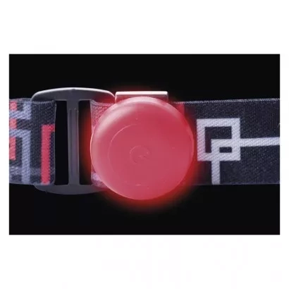 Čelovka je vybavena hákem pro zavěšení, píšťalkou například pro přivolání pomoci a vzadu na popruhu je červené světlo.