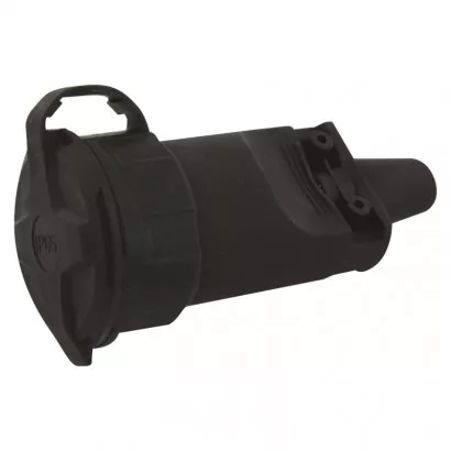 Gumová zásuvka pro pohyblivý prodlužovací přívod. Je určena k připojení elektrických zařízení kde je vyžadován vyšší stupeň krytí (i v exteriéru).