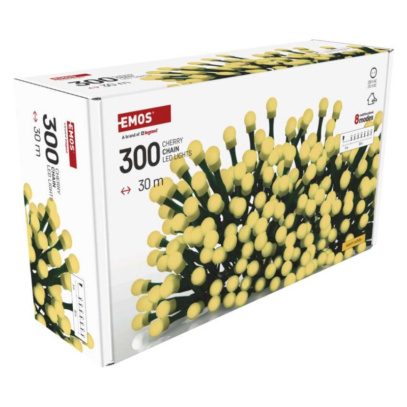 EMOS LED vánoční cherry řetěz – kuličky, 30 m, venkovní i vnitřní, teplá bílá, programy,časovač