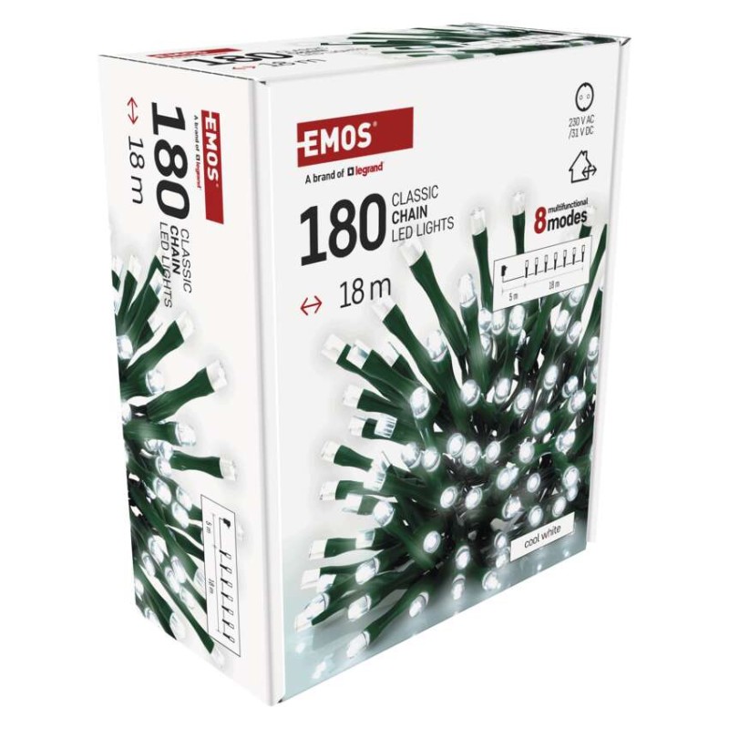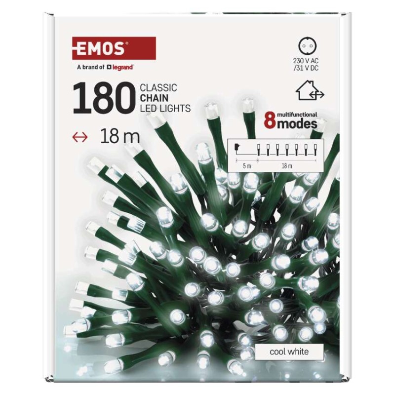 EMOS LED vánoční řetěz, 18 m, venkovní i vnitřní, studená bílá, programy, časovač