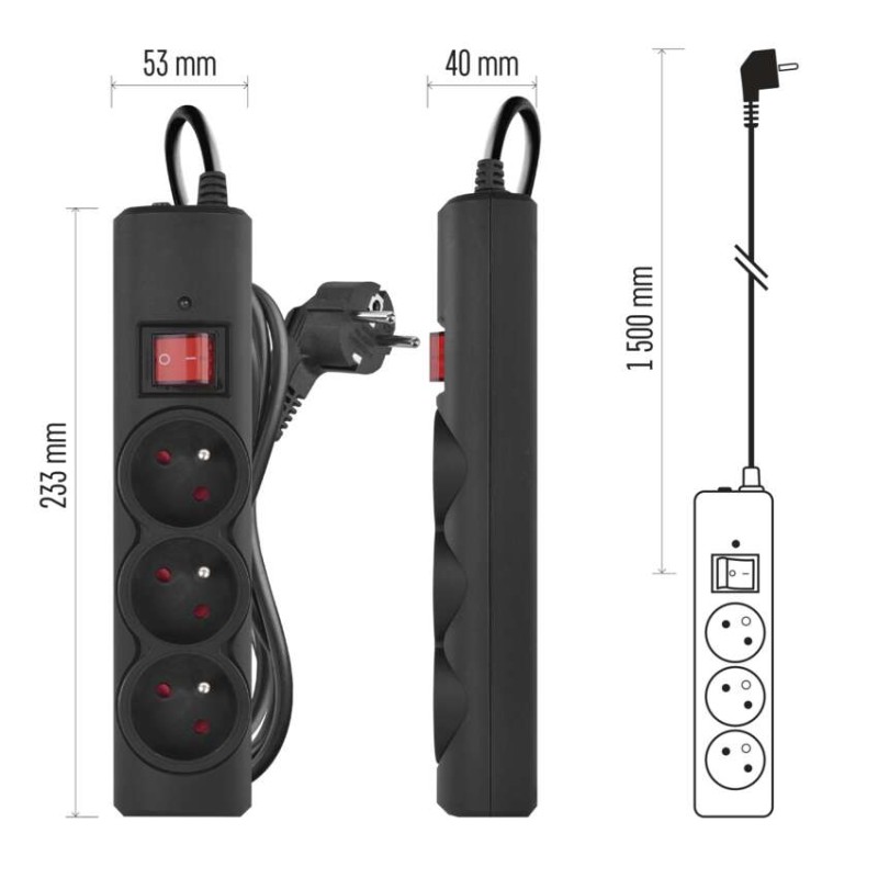 EMOS Přepěťová ochrana – 3 zásuvky, 1,5 m, černá