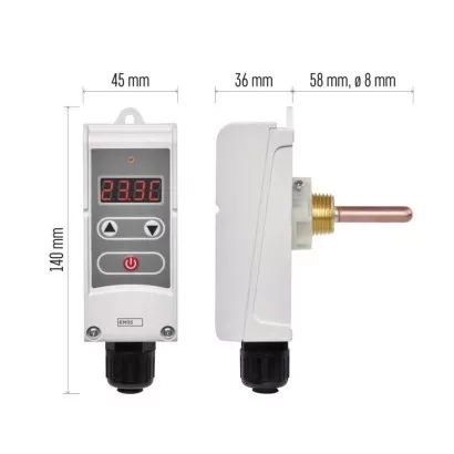 Používá se nejčastěji v kombinaci s bojlerem nebo akumulační nádrží. Čidlo je instalováno přímo na bojler včetně těla termostatu. Možnost zapojení do vytápěcího systému i chladící jednotky. Šetří náklady na vytápění i chlazení. Jednoduché a uživatelsky přívětivé ovládání. Přehledný podsvícený displej. Přesné nastavení teploty díky disleji. Kontrolka sepnutí termostatu (svítí červeně, pokud termostat sepne). Nastavení teploty od 5 °C až do 80 °. Napájení do sítě (230 V). Součástí je gumová průchodka, která slouží k ochraně připojených vodičů. Umožňuje regulaci teploty, hlídání teplotních omezení a funkci poklesu teploty.