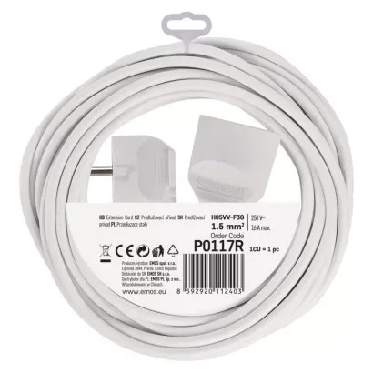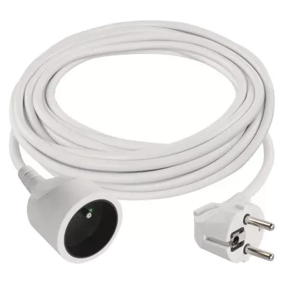 Bílý prodlužovací přívod s jednou zásuvkou - spojka, délkou 7 m a průřezem vodiče 1,5 mm2. Vhodný pro maximální zátěž 16 A max.
