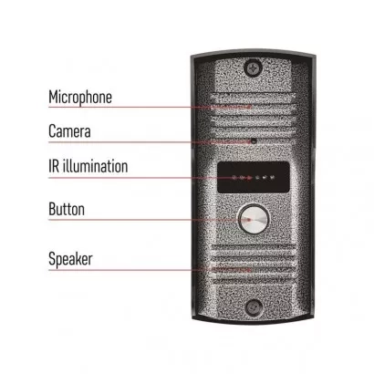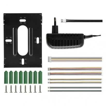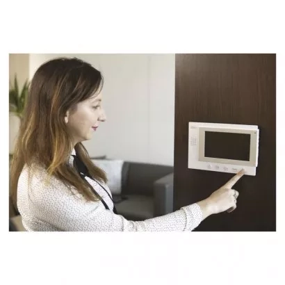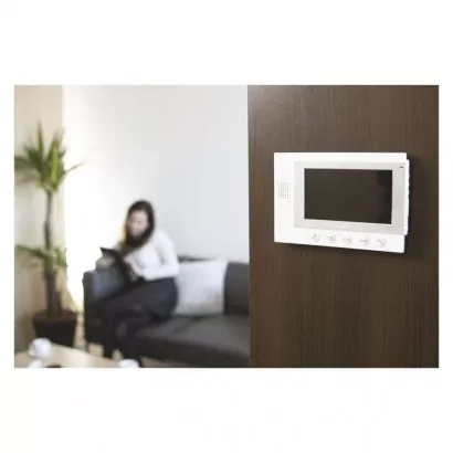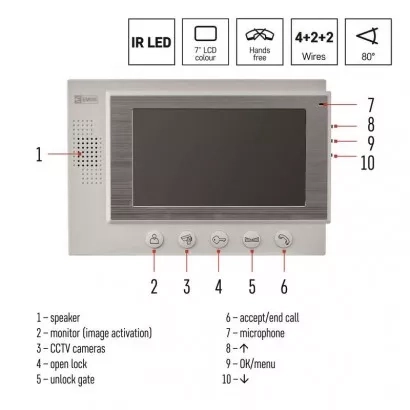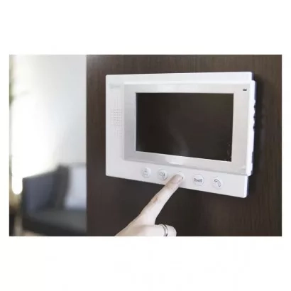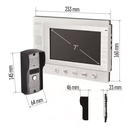 Jednoduchá sada videovrátného. Obraz je zobrazován na velký 7" barevný LCD. Přístroj je napájen pomocí přiloženého adaptéru na 12 V. Zařízení umožňuje obsluhu dveřního zámku a pojezdu brány.