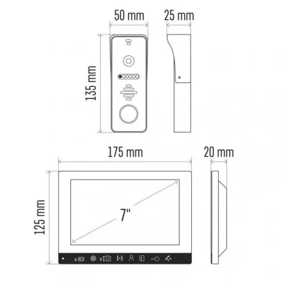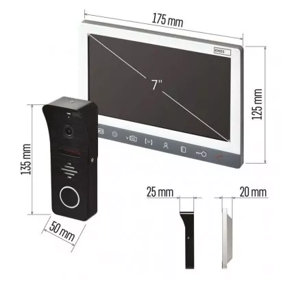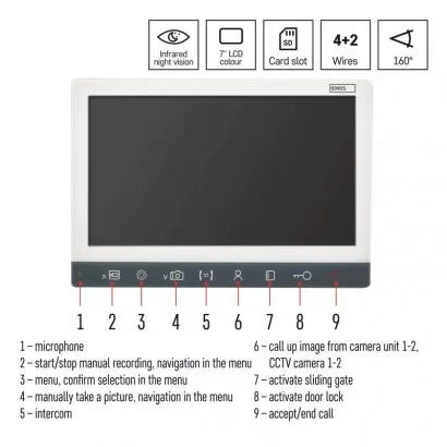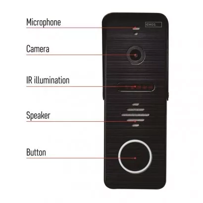 Odolné provedení kamerové jednotky s širokým objektivem.IRcut filtr v kameře, zajišťující špičkový obraz ve dne i v noci.AHD technologie s rozlišením 2 MPx (1080p).Možnost vložení paměťové karty a ukládání snímků, či videí.Možnost vložení vlastní vyzváněcí melodie. Přehledné grafické menu v místní jazykové lokalizaci.