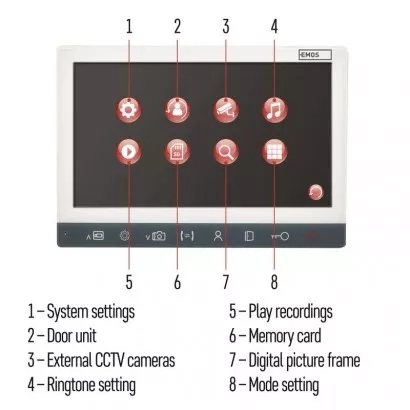 Sada videotelefonu a dveřní kamerové jednotky s HD přenosem obrazuVysoce kvalitní přenos obrazu za všech světelných podmínek. Dveřní kameroví jednotka v provedení antivandal s objektivem, snímající scénu v ůhlu 120°Možnost ukládání fotografií a videa na paměťovou kartu. Funkce intercomu a digitálního fotorámečku.
