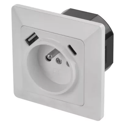 Zásuvka jednonásobná s ochranným kolíkem s USB nabíjením. USB výstup 5 V DC 3 A max. Vestavná hloubka 41 mm. Doporučuje se použití instalačních krabic o hloubce min. 60 mm a hlubších. Nelze používat k datovému přenosu.USB typ A: 5 V DC/ 3 A, 15 W max.; 9 V DC/ 2 A, 18 W max.; 12 V DC/ 1,5 A, 18 W max.; USB typ C 5 V DC/ 3 A, 15 W max.; 9 V DC/ 2,22 A, 20 W max; 12 V DC/ 1,67 A, 20 W max; USB A+C 5 V DC/ 3 A, total 15 W max. Nabíjecí protokol PD 3.0.