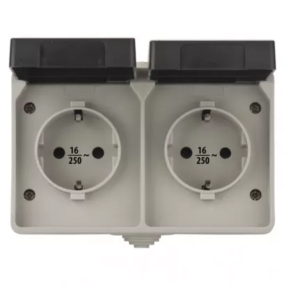 Produkty SCHUKO nejsou určeny pro použití v ČR, PL a SK. Jsou určeny pro použití v zemích se systémem SCHUKO.Kvalitní nástěnná voděodolná SCHUKO dvojzásuvka s ochraným víčkem.