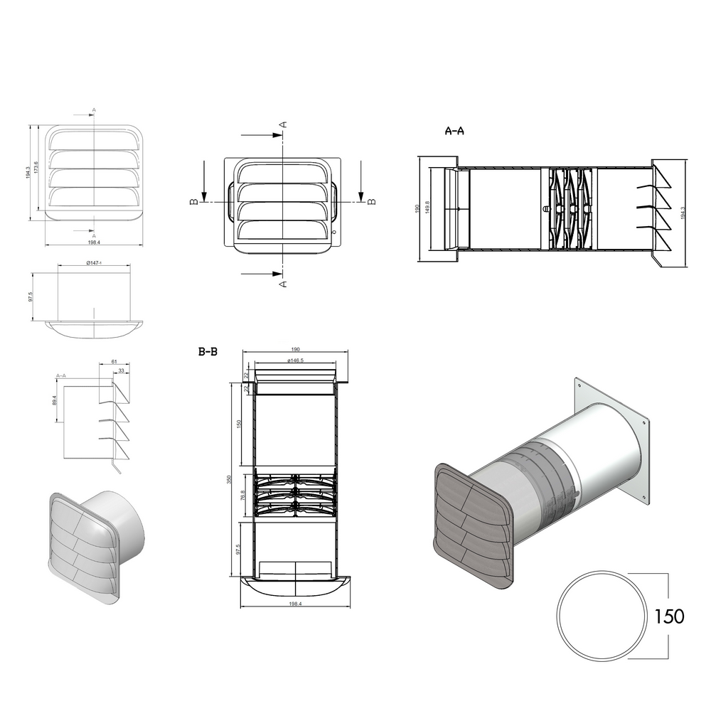 Teleskopická stěnová příruba s Thermoboxem a venkovní nerezovou žaluzií. Aerodynamicky tvarované směrové lamely žaluzie E-Jal Col zabezpečují optimální odvod vzduchu.