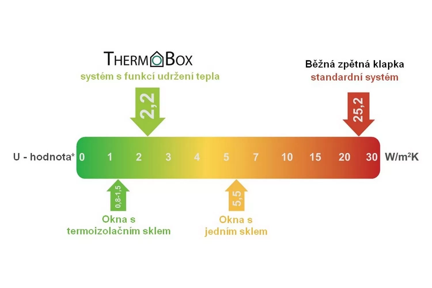 Hodnotou součinitele prostupu tepla U, který je pouze 2,2 W/(m2K) se výrazně odlišuje od standardních zpětných klapek (cca 25 W/(m2K)) a dosahuje tepelně izolačního účinku, který je porovnatelný s okny s izolačním sklem.