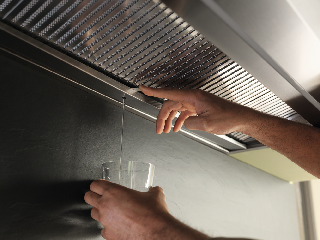 • Nakloněné nerezové filtry – účinné zachycení mastnoty a vlhkosti s odvodem do praktické nádržky