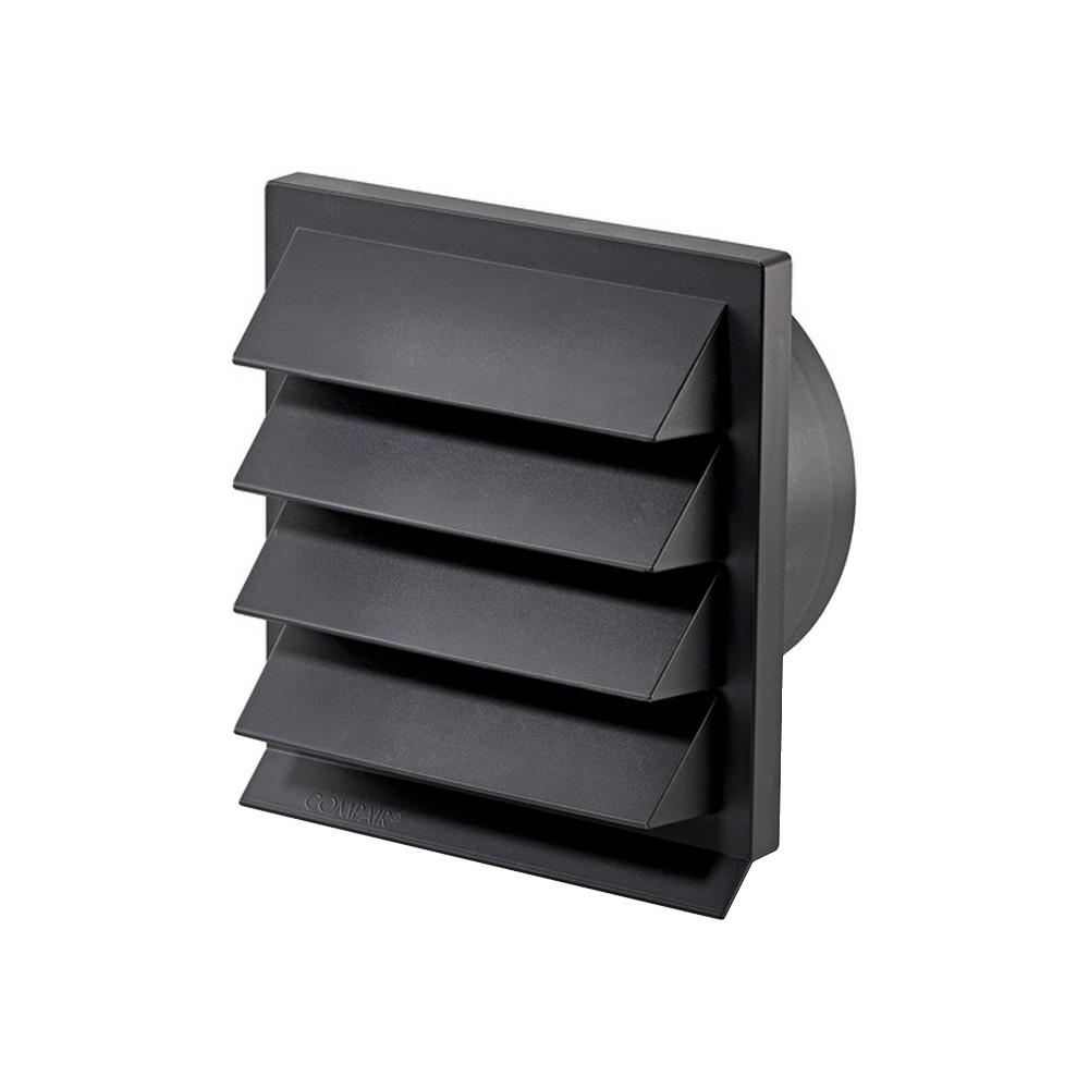 Antracitová plastová venkovní mřížka 190 x 190 mm se zpětnou klapkou je určena pro připojení na kulaté potrubí v průměru 150 mm. Hloubka připojení je 72,5 mm.
