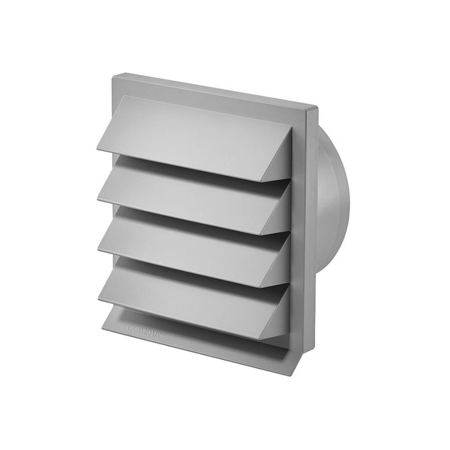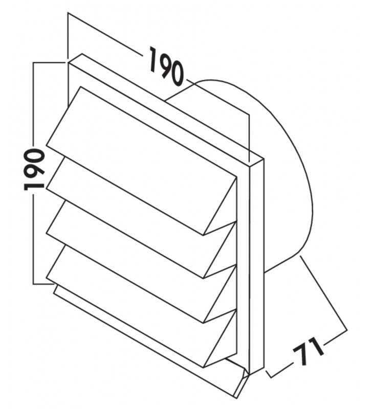 Světle šedá plastová venkovní mřížka 190 x 190 mm bez zpětné klapky je určena pro připojení na kulaté potrubí v průměru 150 mm. Hloubka připojení je 71 mm.