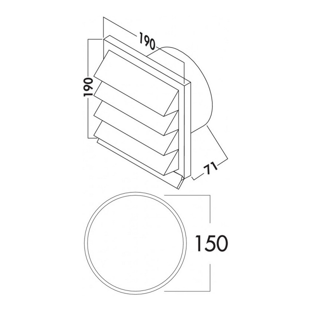 Světle šedá plastová venkovní mřížka 190 x 190 mm se zpětnou klapkou je určena pro připojení na kulaté potrubí v průměru 150 mm. Hloubka připojení je 72,5 mm.
