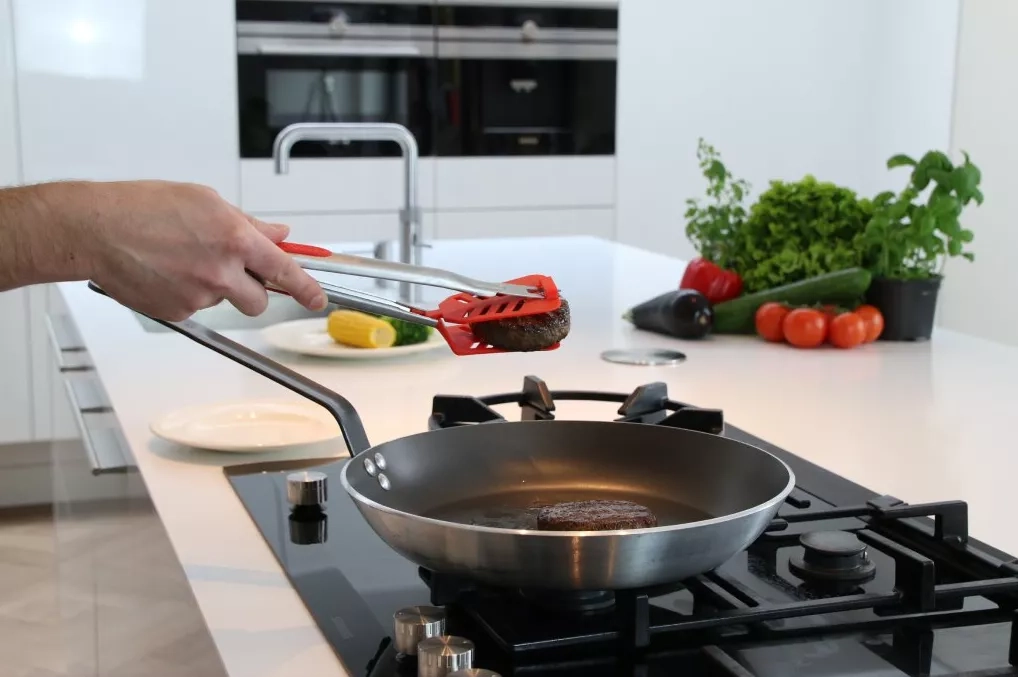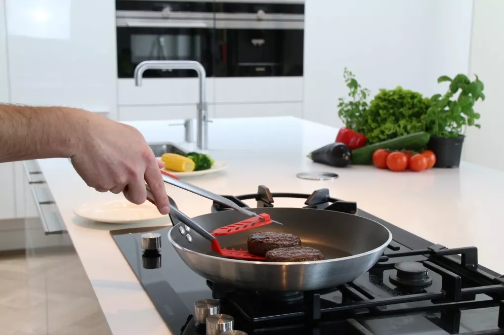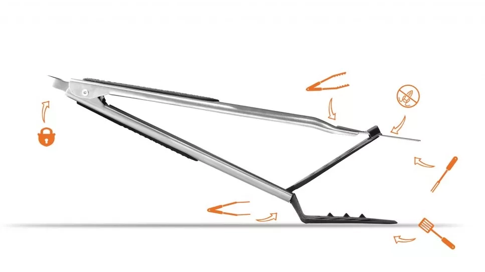 S multifunkčním nástrojem Stingray 6v1 jednoduše naberete hamburger obracečkou (1), otočíte steak z tuňáka kleštěmi (2) uchopíte klobásu ozubenými kleštěmi (3), napíchnete kus zeleniny vidlicí (4) a jemně ji stáhnete z vidlice s pomocí uvolňovacího systému (5). Pokud je něco na vidlici, uvolňovací systém se aktivuje jemným stisknutím. Stingray kuchyňská obracečka dokáže s citem napíchnout jídlo na vidlici, aniž by nebylo odmrštěno a neskončilo mimo talíř. Zaoblená spodní část obracečky zajistí, že nástroj položený na pracovní plochu zůstane v pozici (6), kdy pod sebou nezanechá skvrny.