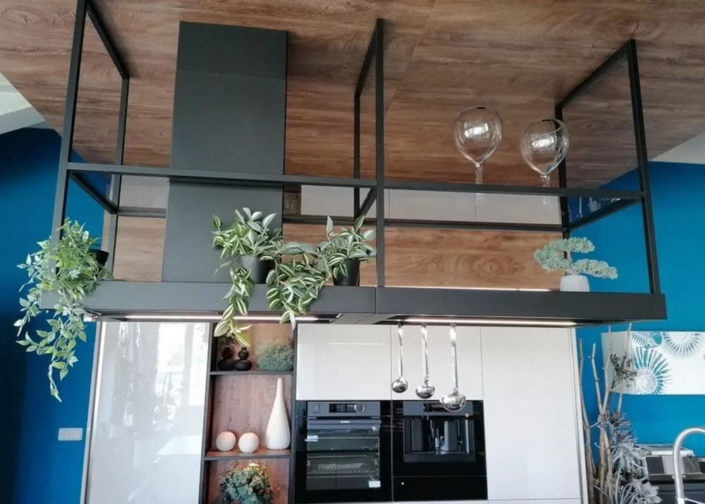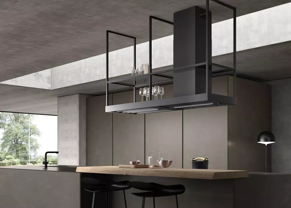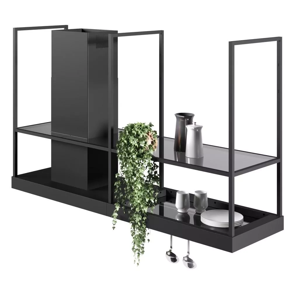 T-Shelf je ikonická ostrůvková digestoř v elegantním industriálním stylu. Díky vzdušné závěsné konstrukci, praktickým policím z kouřového skla a dvěma LED panelům se stmívačem osvětlení se snadno stane centrálním prvkem moderní kuchyně. Elegantní matně černý odstín RAL 9005 se bude hodit do každého interiéru.