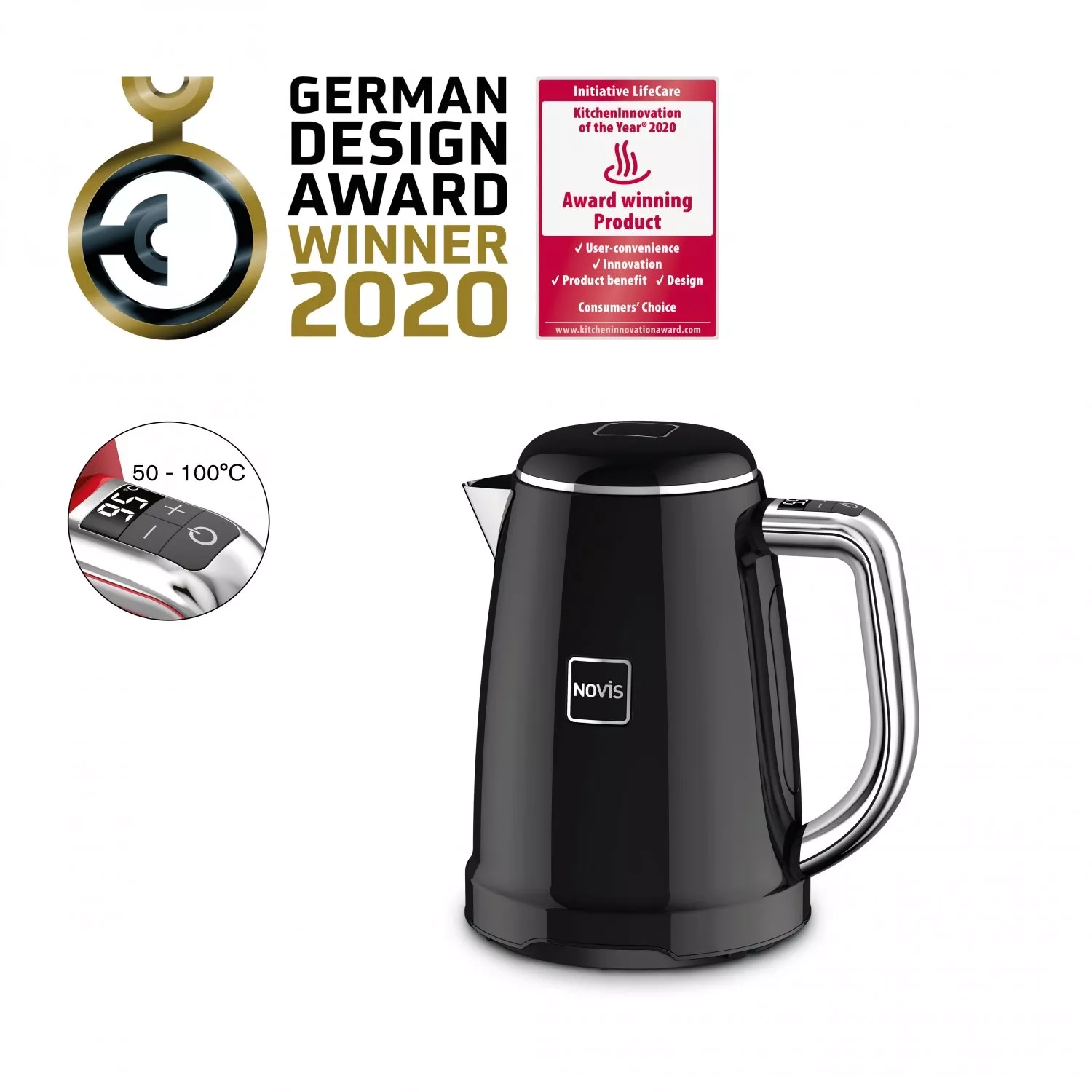 Atraktivní design rychlovarné konvice Novis Kettle KTC1 zaujal nejen zákazníky, ale i profesionály v oblasti desginu, o čemž svědčí udělená cena German Design Award pro rok 2020. Konvice vyniká skvělým zpracováním a použitím kvalitních materiálů, kterým dominuje odolná nerezová ocel a prémiový lak v několika odstínech.