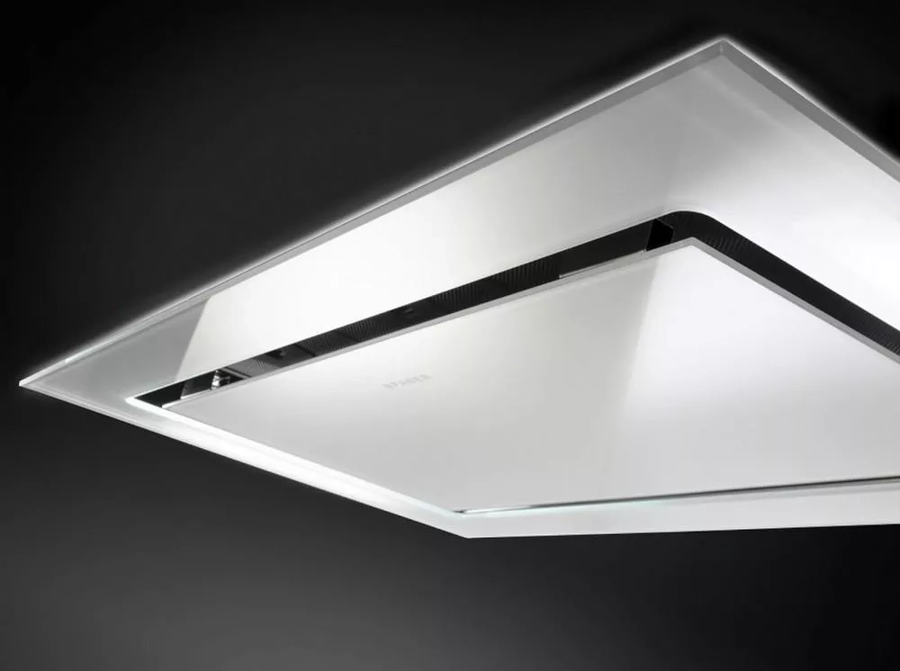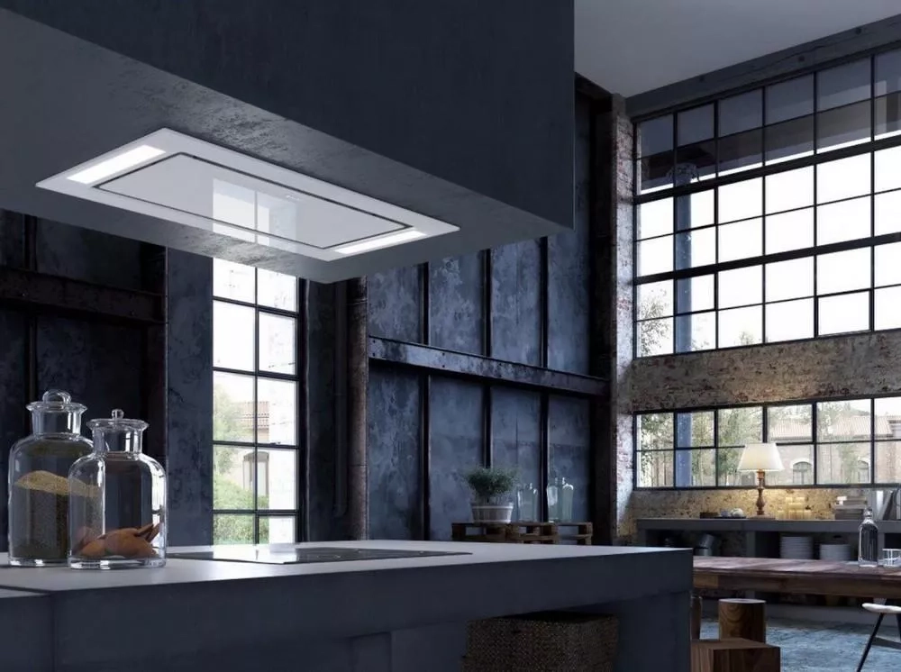 Plné zapuštění digestoře do stropního podhledu zajišťuje maximální volný prostor nad pracovní plochou a kuchyň se díky tomu stává vzdušnější.