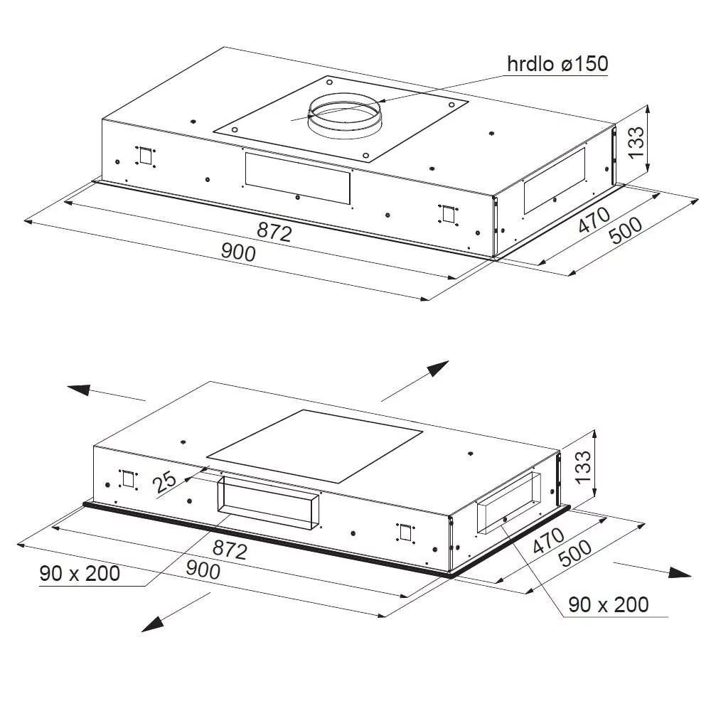 Zásluhou nízké vestavné části je možné ji instalovat i do velmi nízkých podhledů. Pro zabudování digestoře stačí pouze 133 mm a potrubí je možné napojit jak z boční části korpusu, tak shora.