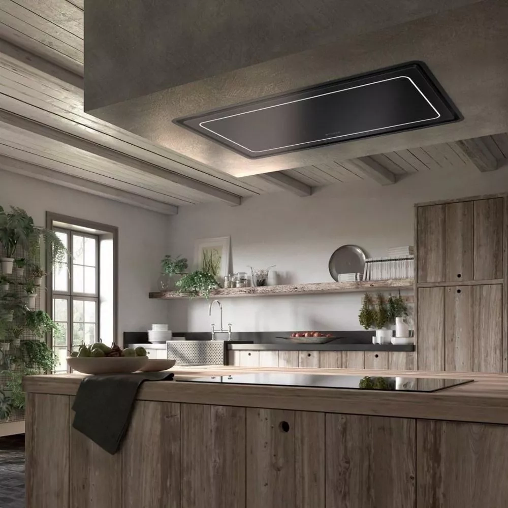 Odsavač v matně černém provedení se stane přirozenou součástí vaší kuchyně, neruší výhled při vaření a je vhodný především do větších prostor, které vzniknou spojením kuchyně s obývacím pokojem.