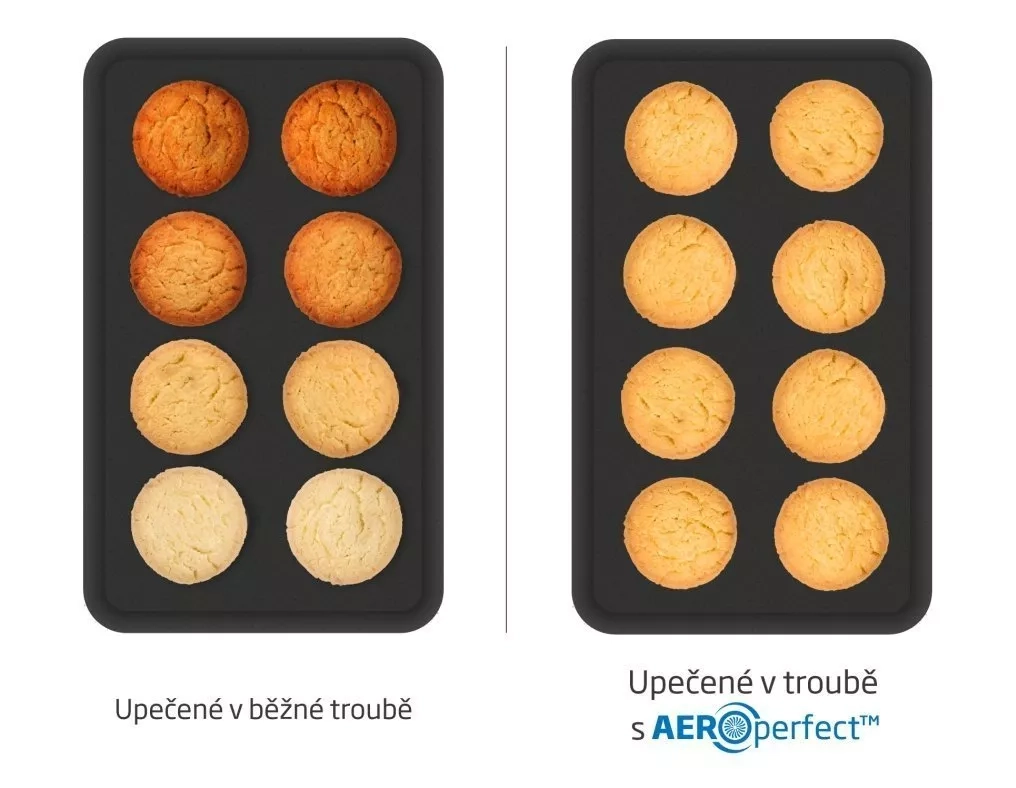 AeroPerfect™ je kombinace speciálního ventilátoru a upraveného prostoru trouby, které zajišťují rovnoměrné pečení jídla. Rozloží teplo ze všech stran pokrmu bez rozdílů teplot, takže se jídlo v troubě peče všude stejně. Výsledek je bez popraskání, spálení jedné strany či nedopečení druhé a vypadá i chutná perfektně. A navíc trouba peče úsporněji, takže šetří i náklady na elektřinu.