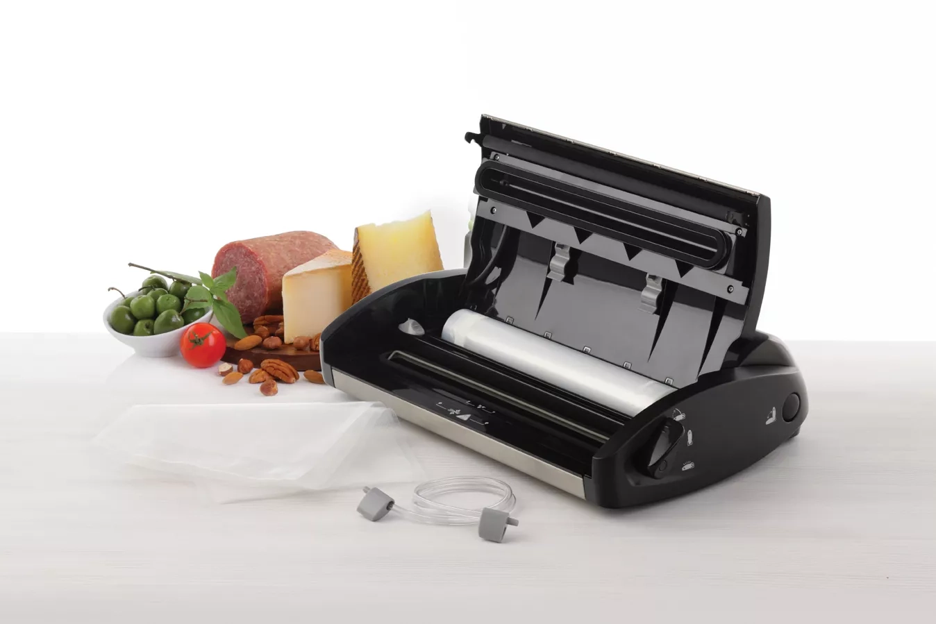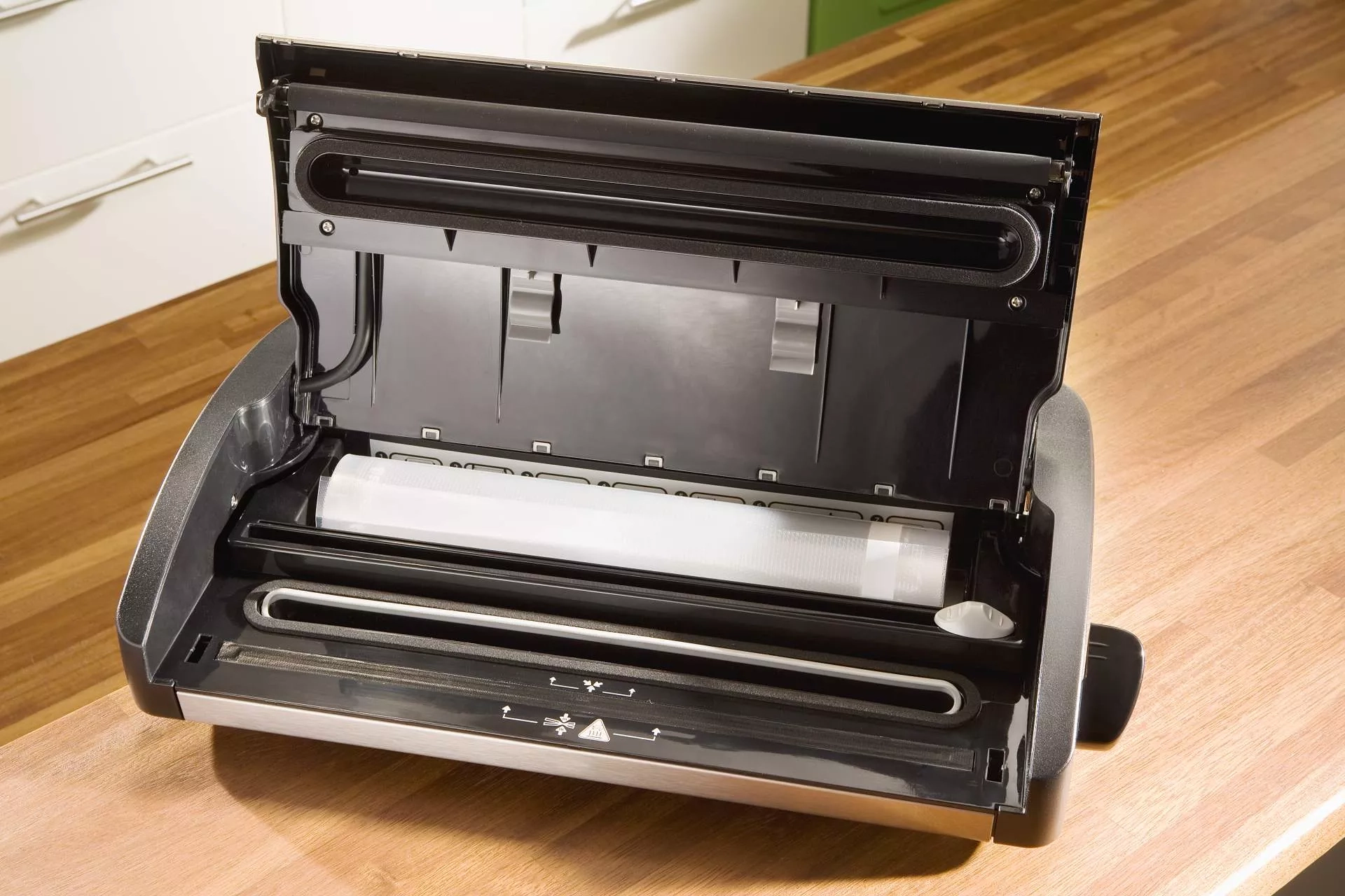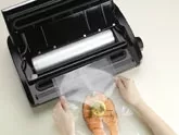 Přístroj má integrovaný řezací nůž, který slouží pro přípravu sáčků. Zároveň disponuje i užitečným zásobníkem pro fólii v roli.