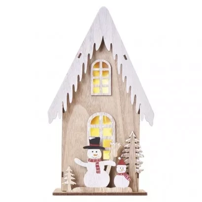 EMOS LED dekorace dřevěná – domek se sněhuláky, 28,5 cm, 2x AA, vnitřní, teplá bílá, časovač