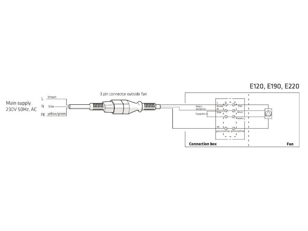 Digestoř a střešní ventilátor jsou propojeny tří žilovým kabelem (cca 2 metry součástí balení), který se jednoduše zapojí do svorek v odsavači. Za každý další metr propojovacího kabelu se cena navyšuje o 100 Kč.