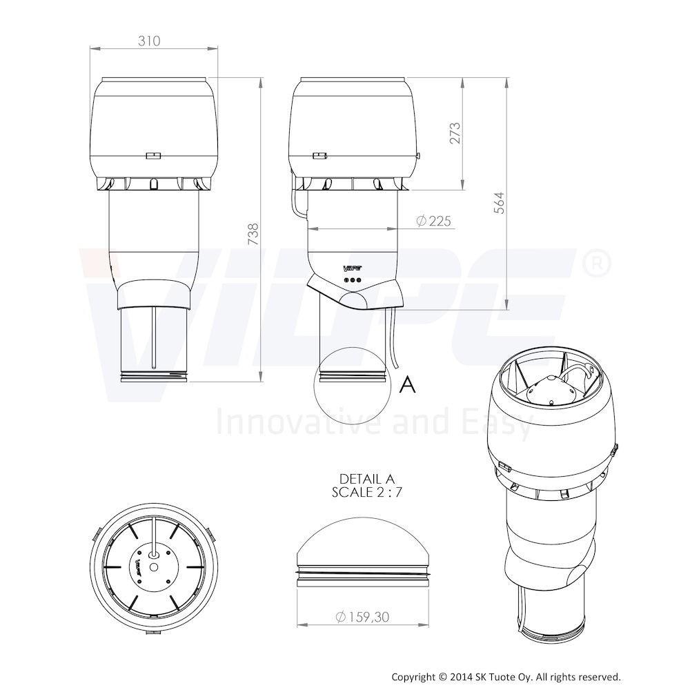 Externí ventilační jednotka od finského výrobce VILPE je vhodná pro instalaci na jakoukoliv střechu - rovnou či šikmou (maximální sklon 57°). Je osazena motorem německé výroby EBM, který dosahuje výkonu 850m3/h.
