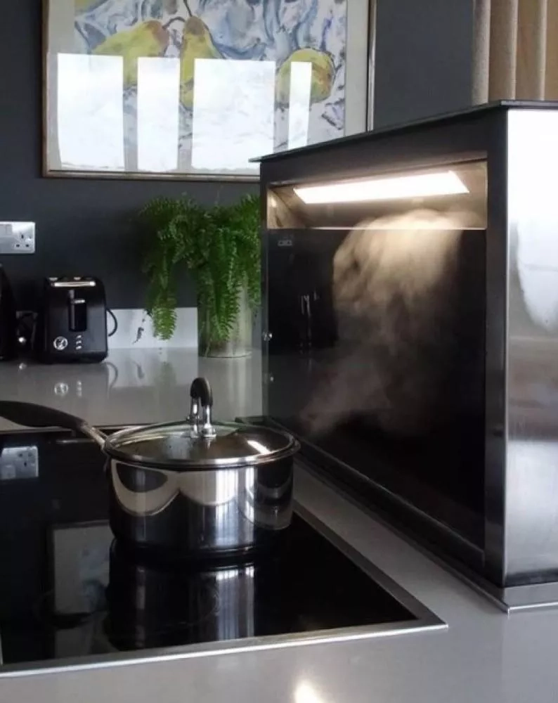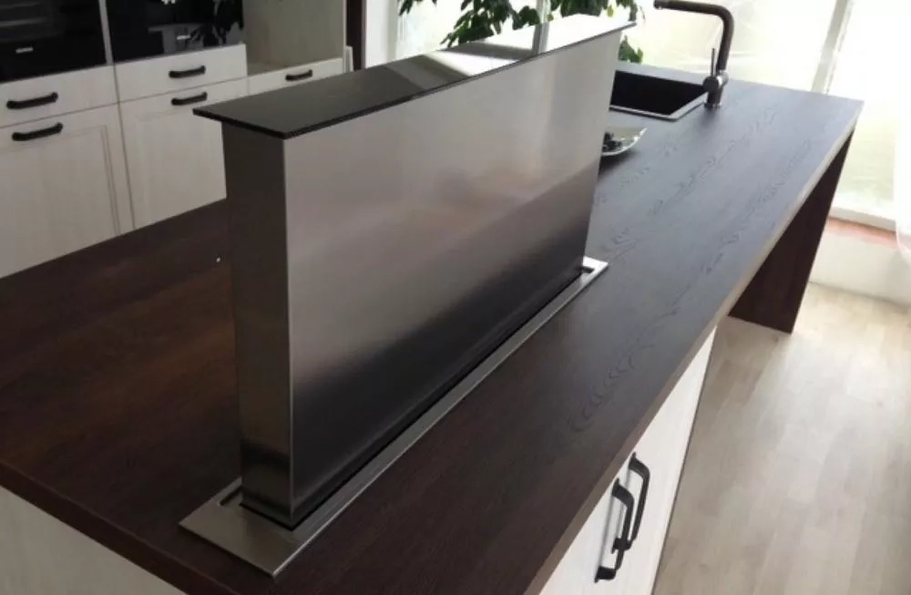 Je určena k instalaci přímo do pracovní desky za varnou plochu. Jakmile ji zapnete, vysune se z pracovní desky sací část a začne odsávat páry a pachy nejen z prostoru nad varnou deskou, ale rovnou z celé kuchyně.