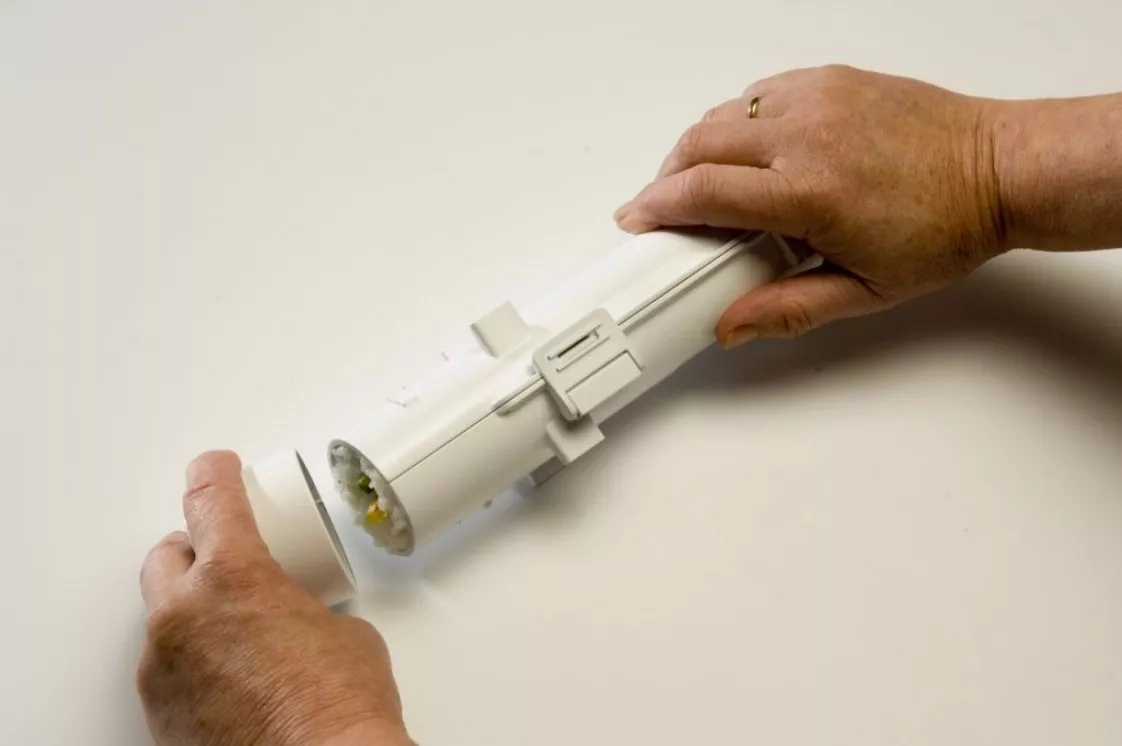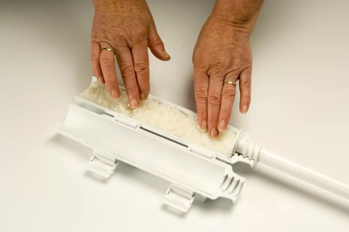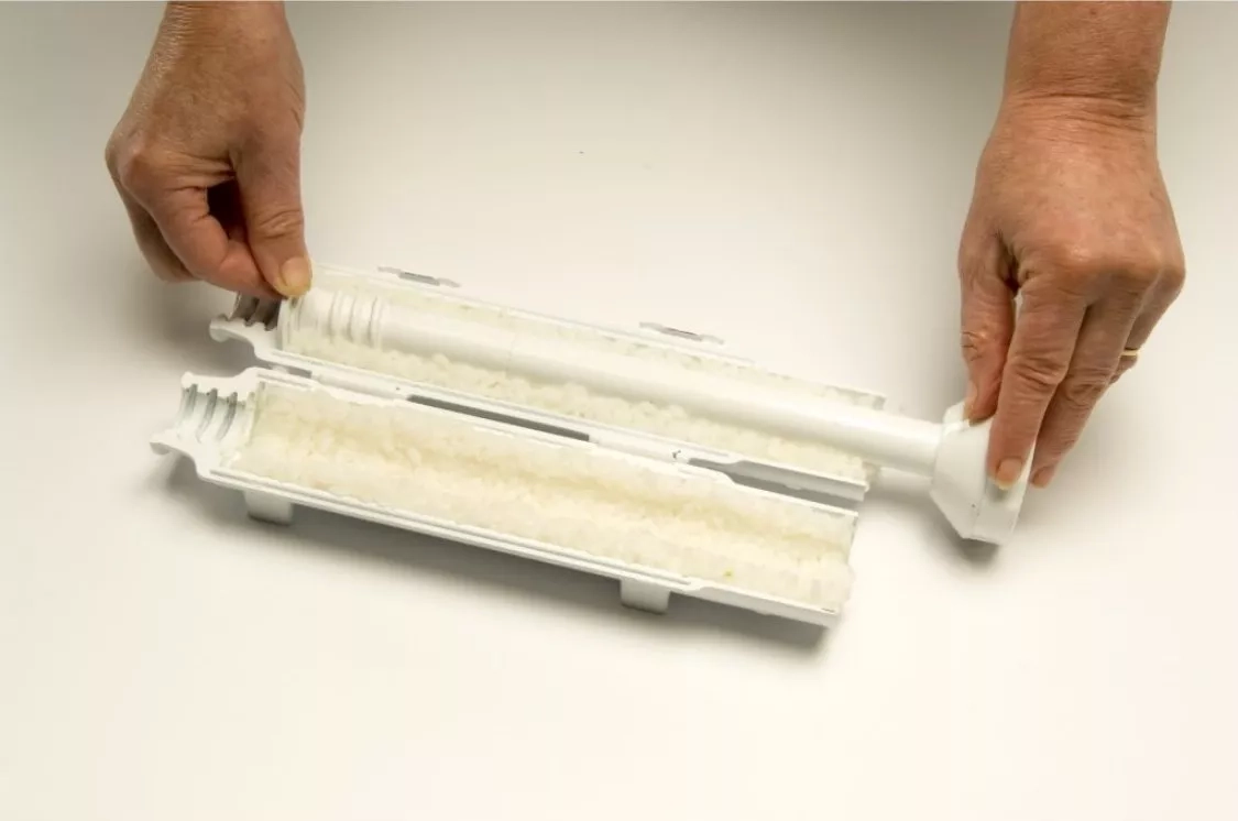 - Otevřete SUSHEZI a vnitřek lehce potřete olejem. Namočte si ruce do vody,usnadní vám to práci s rýží. Ujistěte se, že píst sedí v závitu.