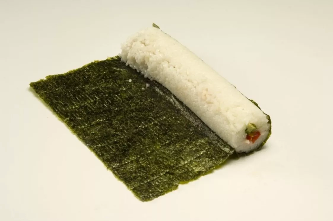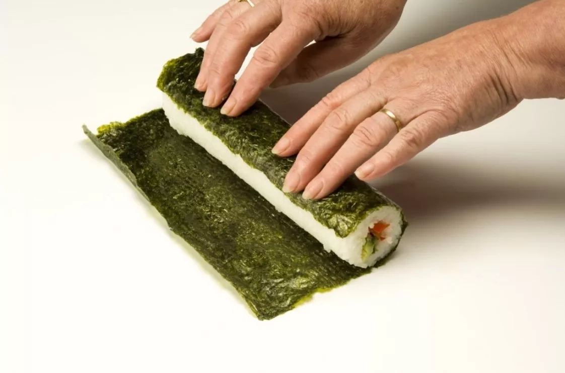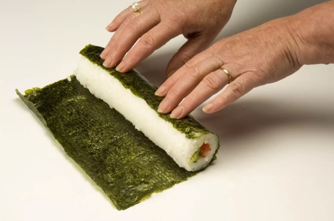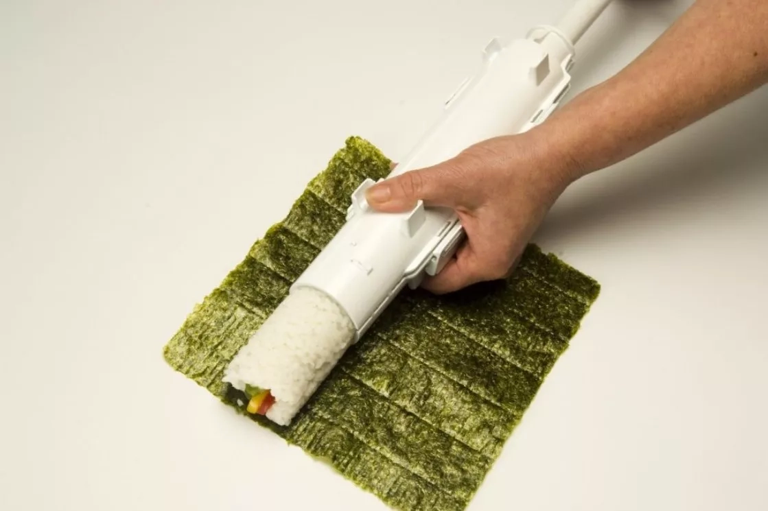 - Otočením odemkněte závěr a vyjměte ho. Na stůl rozložte řasu nori. List řasy položte lesklou stranou (lícem) dolů. Tlakem na píst vytlačte rolku kolmo k ryskám na řase.
