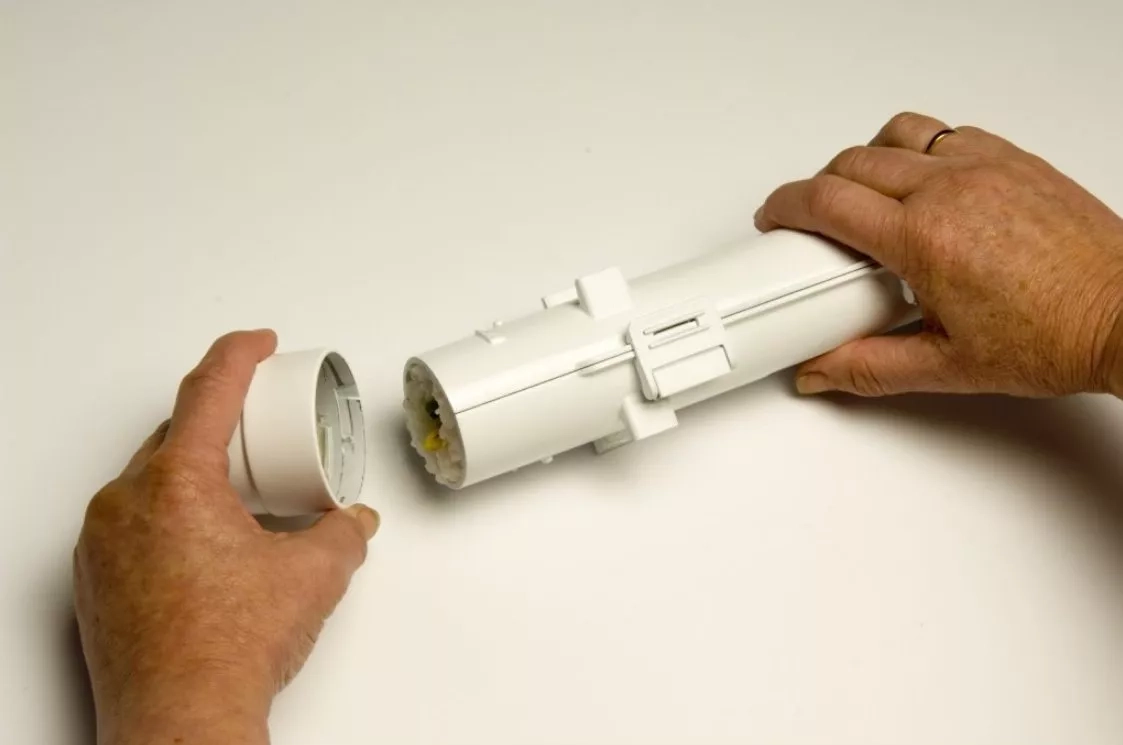- Do vytvořené drážky naskládejte náplň. Píst vložte do závitu. Píst musí být v konečné pozici závitu. Opatrně přivřete obě poloviny k sobě. Začínejte zavírat v úhlu 45°. Zaklapněte obě západky.