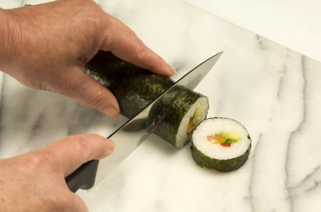 - Sushi můžete okamžitě krájet. Druhou možností je nechat sushi navlhnout asi 10 minut a poté ostrým a mokrým nožem nakrájet. Po každém řezu je dobré nůž otřít.